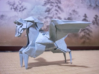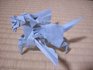 西田さんの見解を答えだと思いたい。 (通じる人にだけ通じる話です) 「1枚の紙を切らずに生物を折る限り、 折り紙はいかなるほかの立体造形芸術よりも、 その生物の発生にまつわる神秘に肉迫している。 発生の神秘を作品に内包している。 」 著作権の騒動(?)のときもそうだったけど、 説得力の高い記述には唸るばかりだ。 恐竜などの空想動物や昆虫を得意とする。 このペガサスは「空想折り紙」という本に その後のバージョンもあるのだけど、 いくつ折ったか覚えていないくらい折った。 表裏同色の紙を使う。