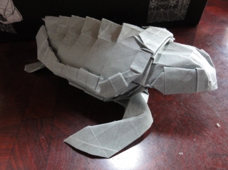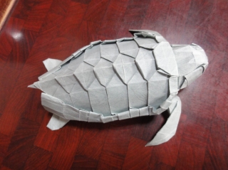 直接お目にかかったことはないけれど、氏のインパクトはあまりに大きいものがあった。 何名か、「ドワーフ」を折っている方がいた。 氏の作品を折ったことはない(氏の世界観を再現できないので)が、公開できる出来栄えになるかは別にして近いうちに折ってみたいと思う。 カメの甲羅の模様の折り出しの前例はラング氏の作品をはじめいくつかあるけど、 この作品もやはり見どころは甲羅の模様で、淵の部分を細かくしているのが特徴。 作例は70kgのOKゴールデンリバー。 これだけ折り図にしにくそうな作品を折り図化した神谷氏がただすごい。 |