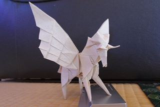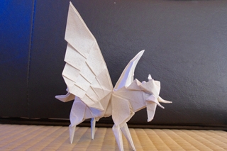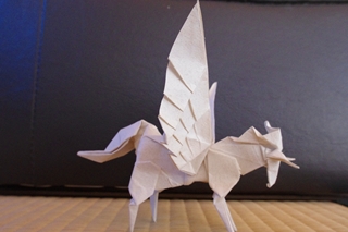 × [PR]上記の広告は3ヶ月以上新規記事投稿のないブログに表示されています。新しい記事を書く事で広告が消えます。 作者:宮島登、ペガサス 宮島氏98年の作品、ペガサス。 第6回コンベンション折図集より。 作者からのコメントには、「多くの方々により折りつくされたテーマ」とあるけど、 今なお、多くの創作が生まれているはずで、 それだけ、創作する方にとっては魅力的なテーマ。 ここでも、川畑氏 http://mthiyodori.blog.shinobi.jp/Entry/12/ と西川氏 http://mthiyodori.blog.shinobi.jp/Entry/27/ と北條氏(作品名は「天馬」) http://mthiyodori.blog.shinobi.jp/Entry/38/ の作品を掲載した。 宮島氏の作品は、これらの作品と比べても翼の力強さがひとつのポイント。 ただ、尻尾がかなり厚くなり、紙を選ぶ。 薄すぎると前半身が弱くなり、厚いと折れない。 作例は70kgのコルキー。 尻尾はぎりぎりの厚さになっている。 PR 作者エリック・ジョワゼル(Eric Joisel)、ドワーフ 氏の訃報に触れて、初めて彼の作品を折ってみた。 紙はレザック96。 人物像がいいと思ったので、ドワーフ。 わずか3ページ13ステップの折り図。 細かい表現付けは当然折り図化されていない。 他の方の作例を調べてみると、 小松英夫さんの作例がすばらしかった。 そんなわけで、仕上げにあたっては、小松さんの作例を参考にしました。 (というか左手などはそのまま真似ただけ。小松さん、すみません) 哀悼の意をこめて、以下に今回の訃報に関連した ドワーフのリンクを貼らせていただきます。 (不都合があればすぐに削除いたします。) 小松英夫さん http://d.hatena.ne.jp/origami/20101015 勝田恭平さん http://ong.blog.shinobi.jp/Entry/638/ 中井努さん http://nak5.cocolog-nifty.com/opc/2010/10/eric-joisel-771.html 立石浩一さん https://sv34.wadax.ne.jp/~tatekoo-net/images/DSC_0084.jpg kamifu-senさん